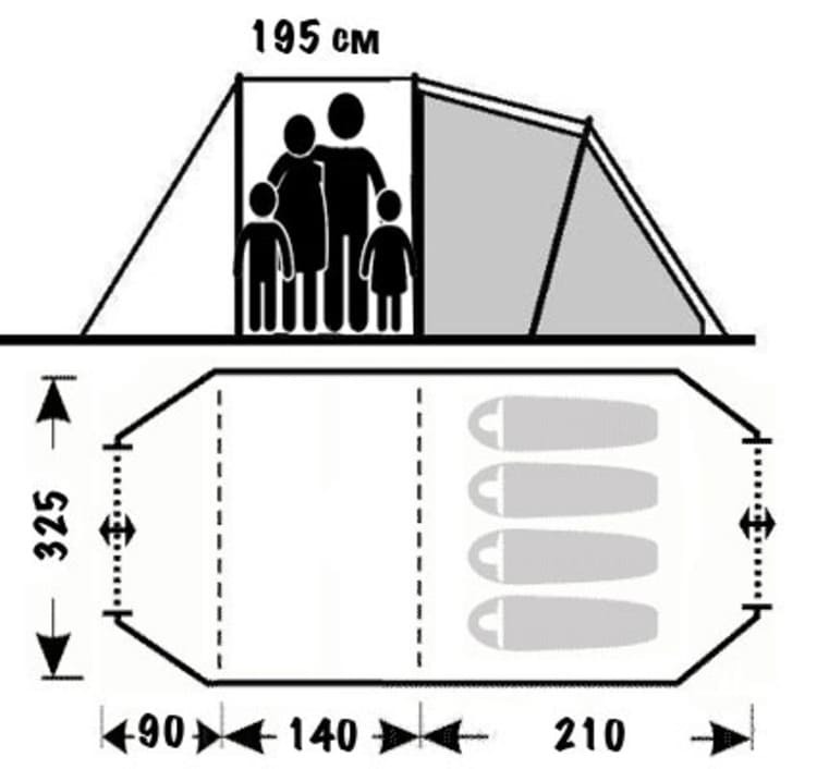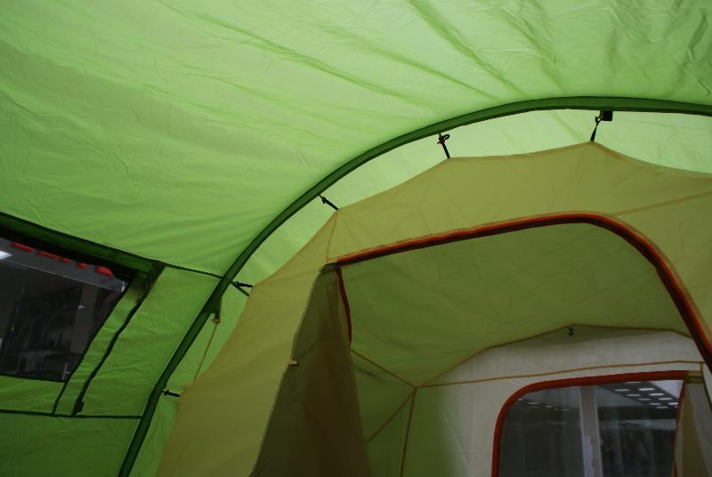 В палатке очень большой просторный тамбур. Там вы можете расположить много вещей и туристическое снаряжение. Высокий потолок кемпинговой палатки Camp House Evolution и большие двери позволяют чувствовать себя в ней удобно даже очень рослым людям.